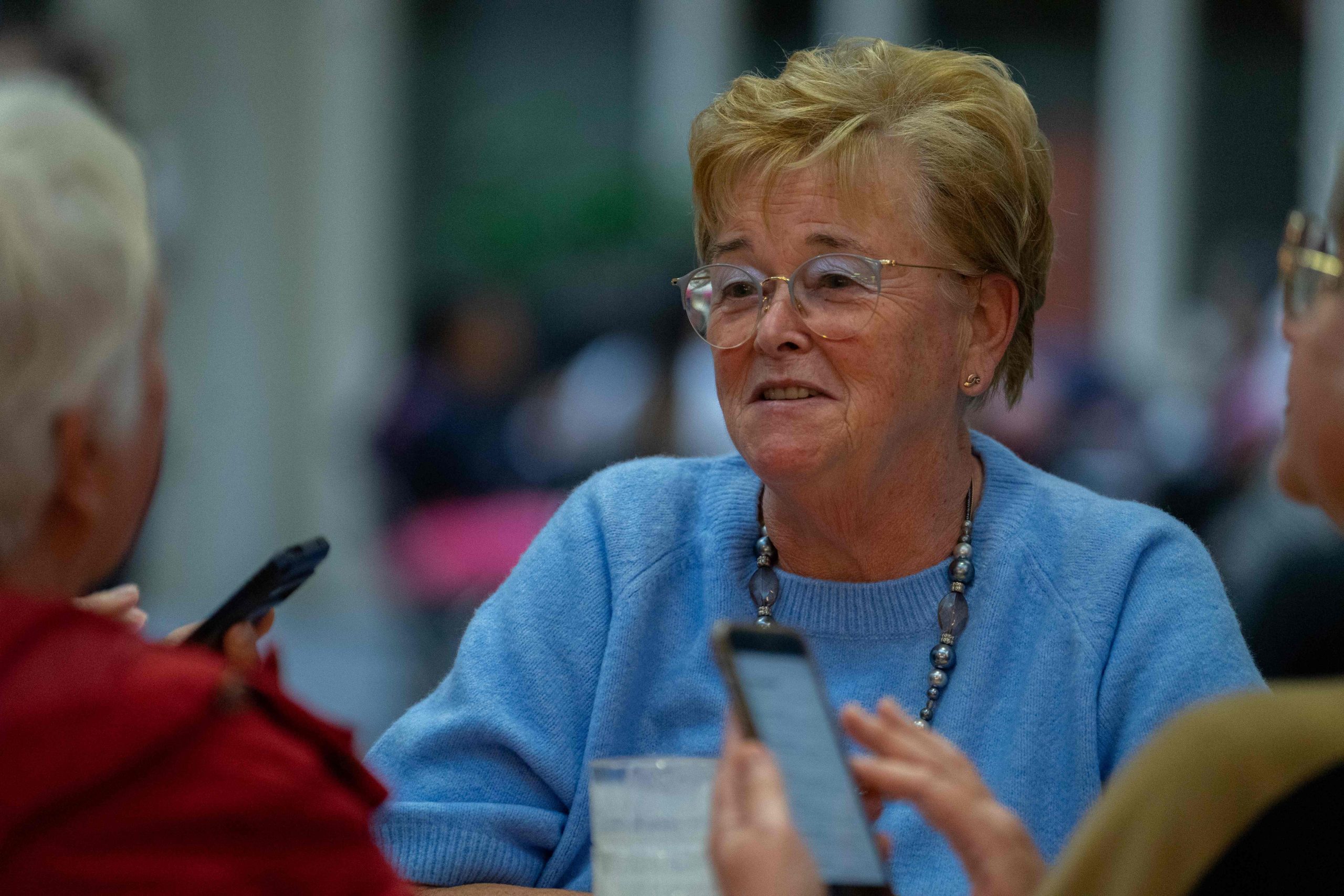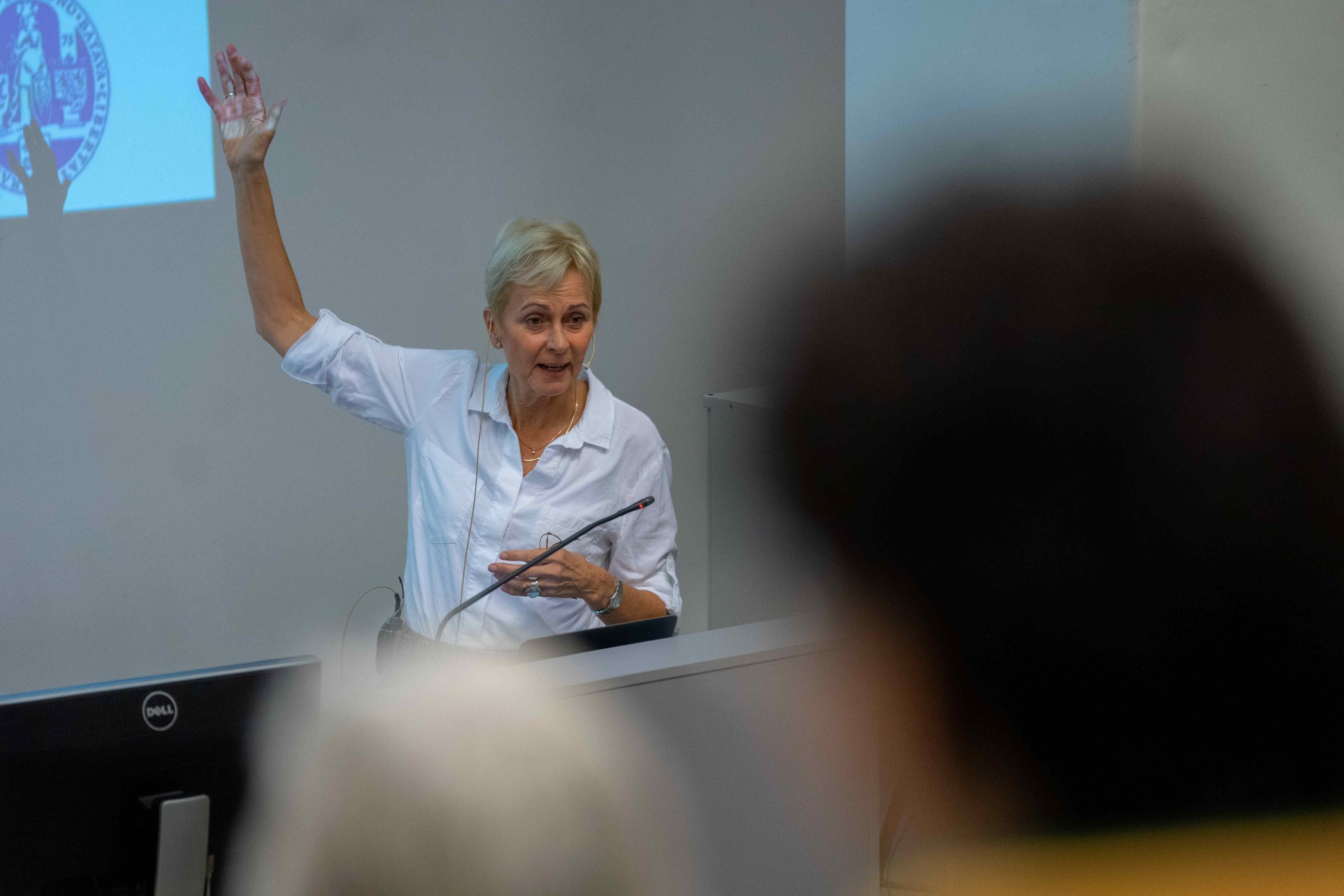 Professor Christine Mummery, hoogleraar ontwikkelingsbiologie, trapt het programma af met een inspirerend verhaal over twintig jaar onderzoek naar ROW/HHT. Ze neemt de zaal mee in het proces van ontdekken, proberen, falen en opnieuw beginnen, maar gelukkig ook successen. Een traject dat jaren kost, maar stap voor stap dichter bij hoopvolle medicatie komt, waarvan nu drie op de horizon. Ze benadrukt hoe waardevol de samenwerking is tussen laboratoria, ziekenhuizen en patiënten.